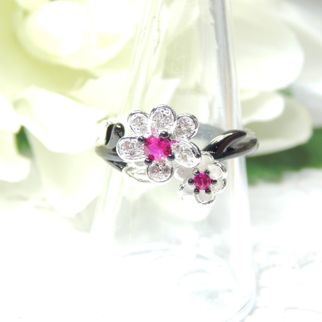 【アウトレット/R/B3】❀ローズストーン梅の花デザインブラックリング❀
